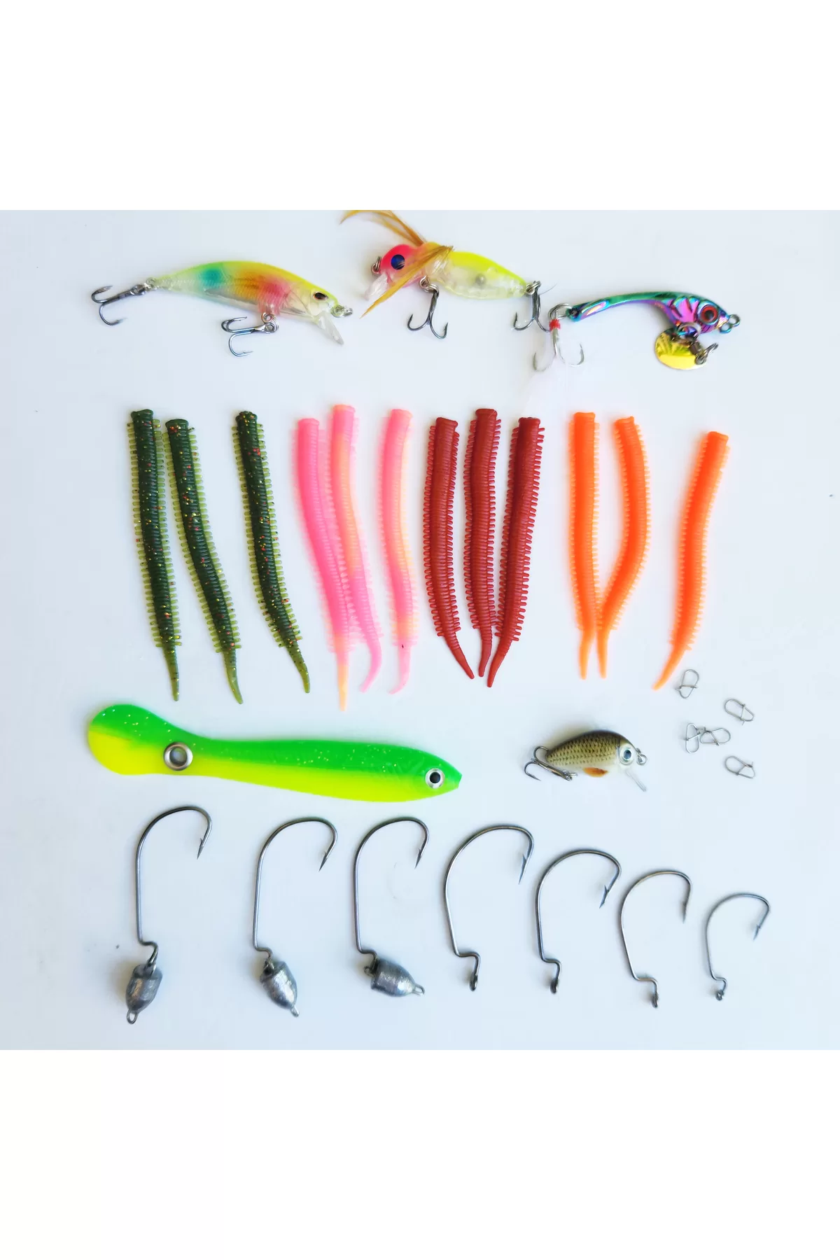1 adet kutu 5 adet mini klips 3 adet 5 gr yapay yem iğnesi 4 ayrı boy ağırlıksız yapay yem iğnesi 1 adet kıvrılma efekli silikon balık 1 adet 1.5 gr lokmalık balık 12 adet yumuşak silikon kurt 1 adet 5.5 gr 5 cm zıpır yapay balık 1 adet biyonik karınca ( 3 gram 4.2 cm dir.