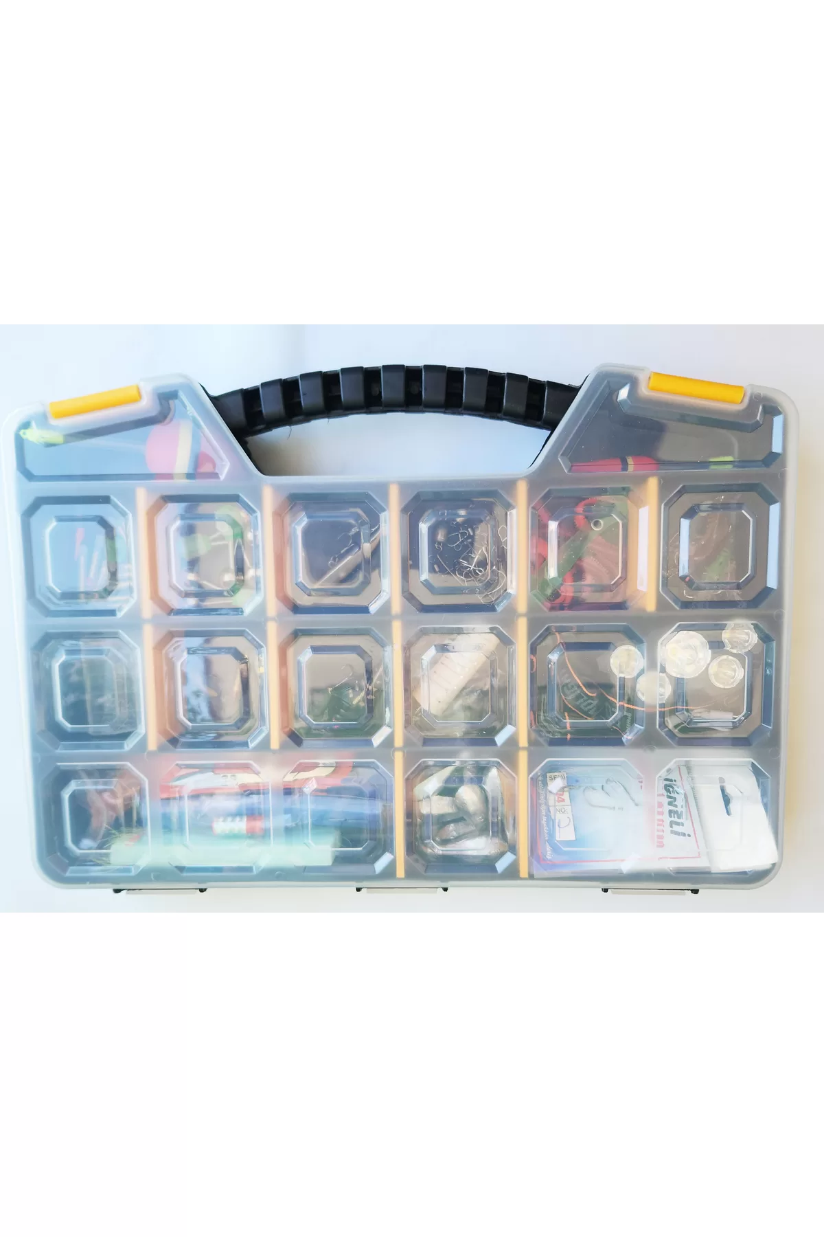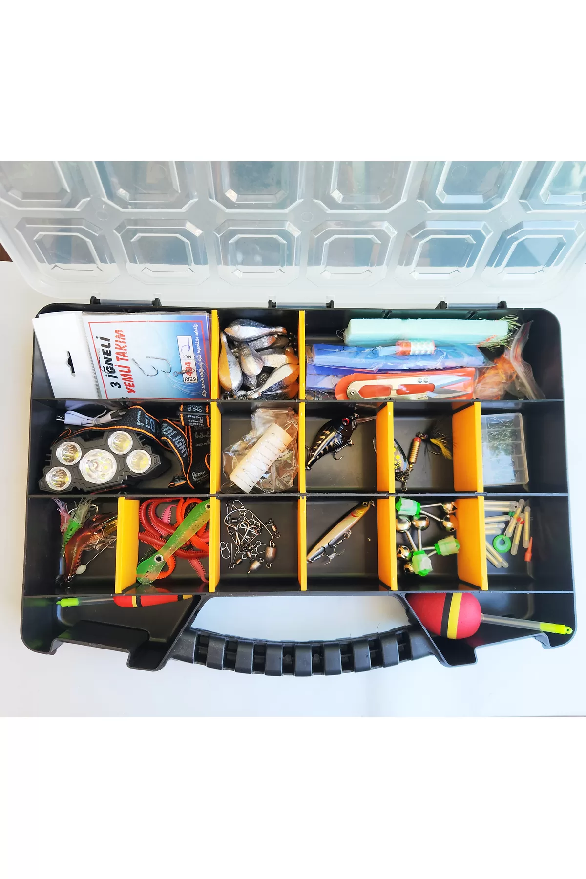 1 adet kutu 42 × 29.5 × 6 cm 1 Adet şarjlı Kafa lambası 3 adet olta zili 1 adet 10 gr yapay yem iğnesi 1 adet 5 gr yapay yem iğnesi 10 adet fosfor 12 adet 4 renk silikon avcı kurt 1 adet silikon kıvrılma efekli yapay balık 1 adet 7.5 cm 10 gram dalarlı yapay balık 1 adet 10 gr spin, kurşun arkası yapay balık 5 adet klips 5 adet fındondölü klips 100 adet (3-12 numara 10 ar adet ) delikli iğne 5 adet stoper 5 adet 1 gr iğneli karides 1 adet 5.5 gr 7.5 cm çelik telli karides 5 adet 3 iğneli fırdondülü hazır bağlı iğne 3 adet 100 gr armut kurşun 3 adet 75 gr armut kurşun 3 adet 50 gr armut kuşrun 5 adet 25 gr armut kuşrun 5 adet 10 gr armut kuşrun 5 adet 5-6 gr delikli kurşun 10 adet 1 gr kıstırma kuşrun 1 adet 6 gr şamandıra 1 adet 40 gr şamandıra 2 adet 10 lu istavrit çaparisi 2 adet çinekop lüfe takımı 3 iğneli 1 adet misina kesme makası 3 adet zargana ipeği 1 adet Kıbrıs kefal takımı 3 adet 6 numara 3 lü iğne 1 adet 12 gr alabalık kaşığı 2 adet çelik tel Stok durumuna göre farklı renk veya muadil ürünler setde değişebilir.